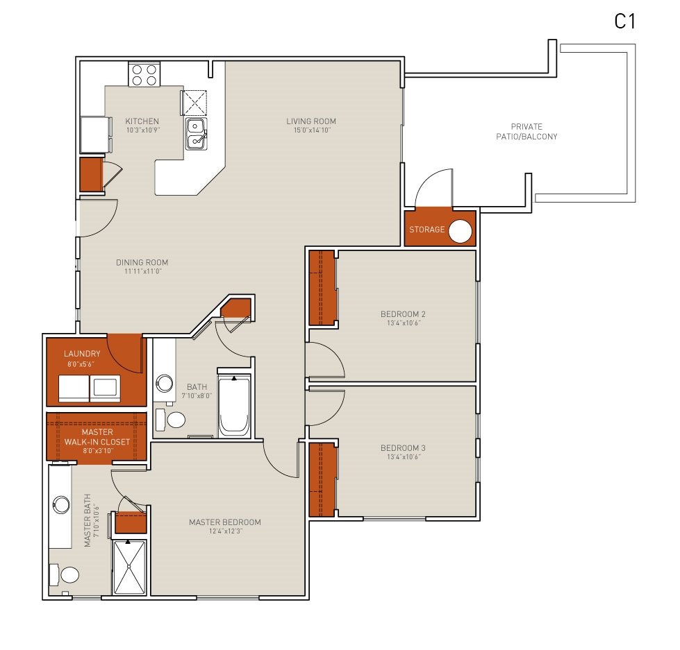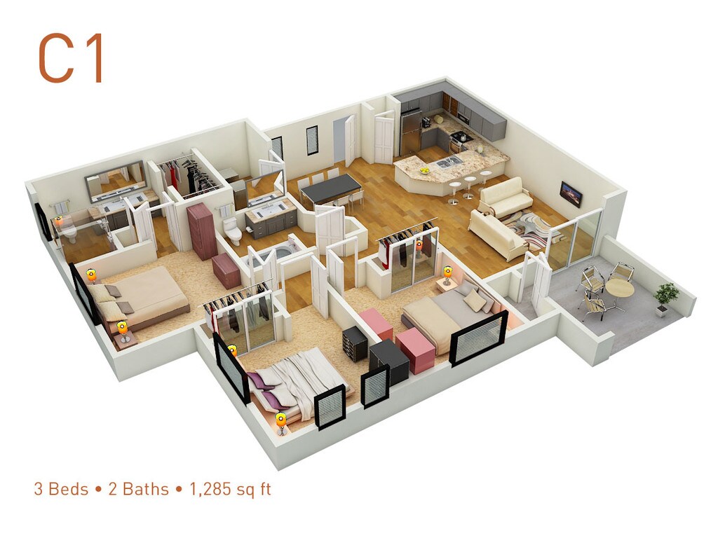 3 Dormitorios, 2 Baños, 1285 pies²Galería del Modelo