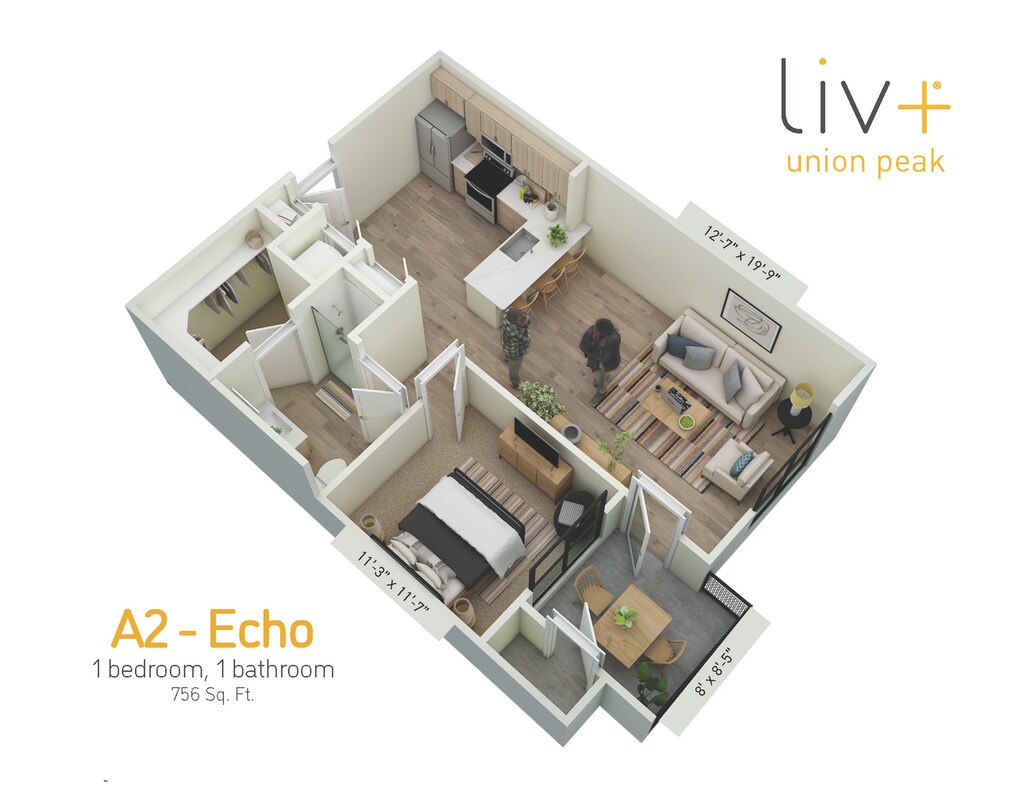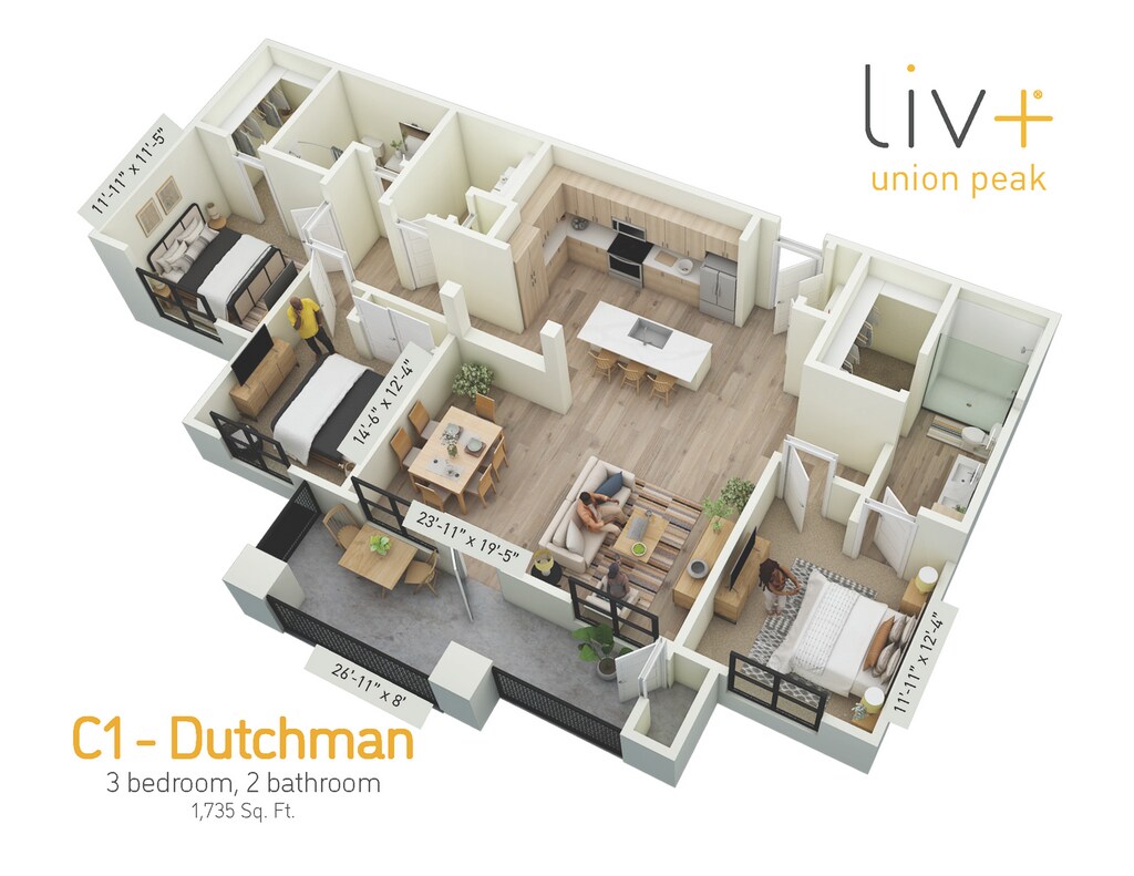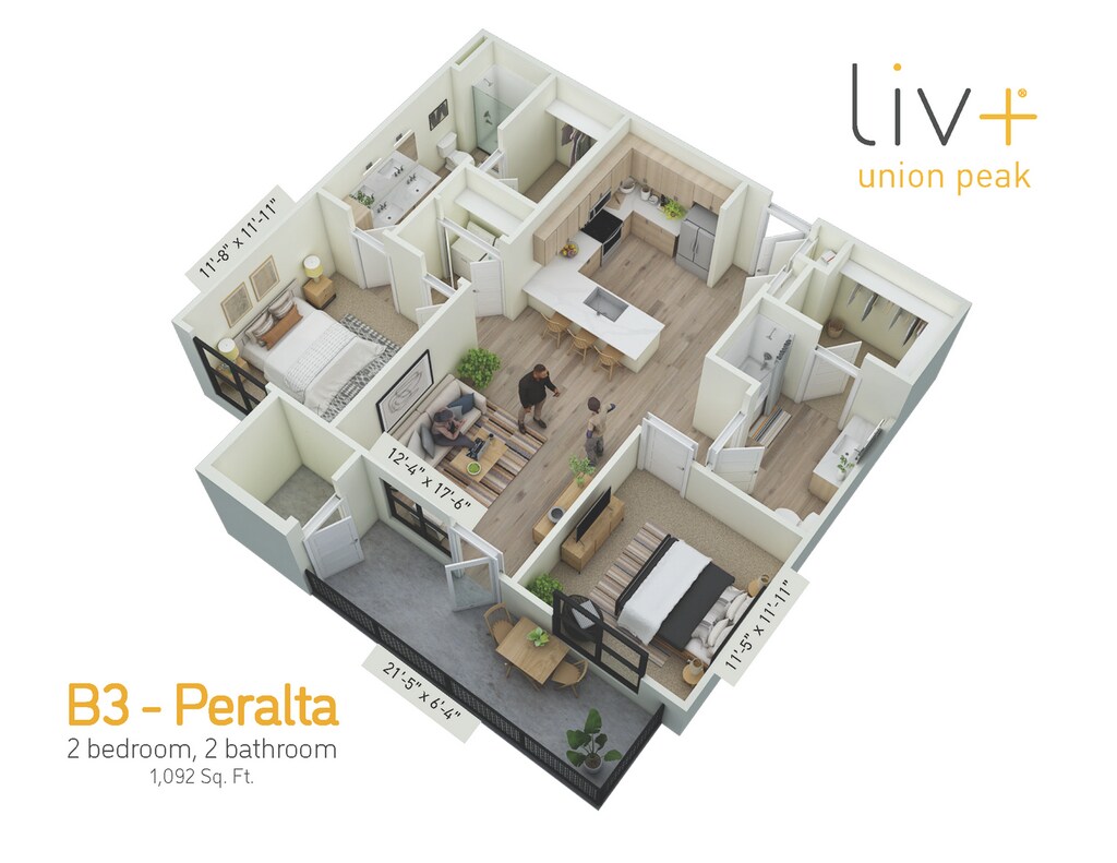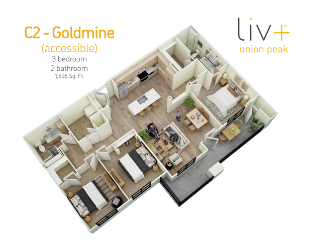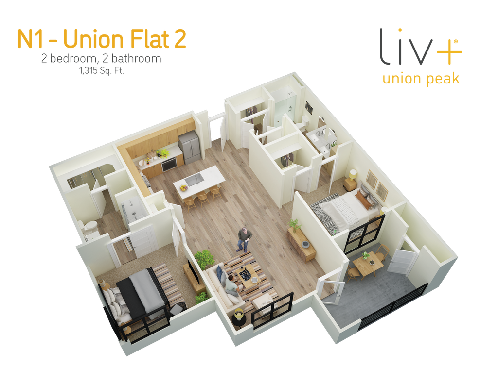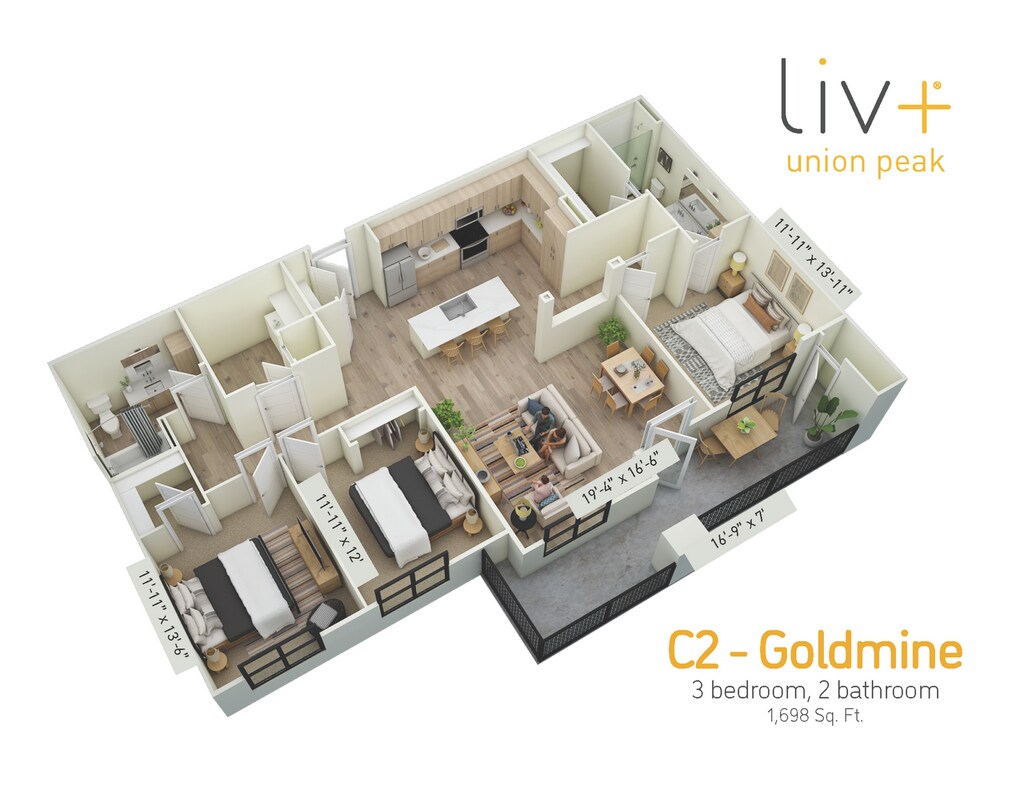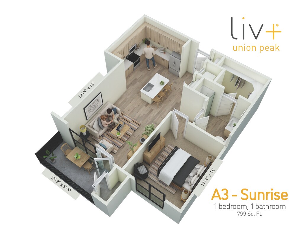 Liv+ Union Peak ofrece apartamentos de Estudio a 3 Dormitorios desde $1,499 con 580–1,735 pies cuadrados. Aquí está el precio actual y la disponibilidad: