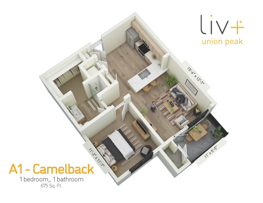 Welcome to Liv+ Union Peak, where exceptional 55+ living awaits in Phoenix. Our thoughtfully designed apartments offer the perfect balance of comfort and sophistication suitable for adults 55 and older. Enjoy designer interiors featuring quartz countertops, a full-size washer and dryer, and smart home technology that enhances everyday convenience. Our community celebrates connection and wellness with resort-inspired amenities designed for an active lifestyle including a heated pool with cabanas, pickleball courts, and a serene Zen Den. The Bark Park and Paw Spa ensure your four-legged companions feel equally pampered.