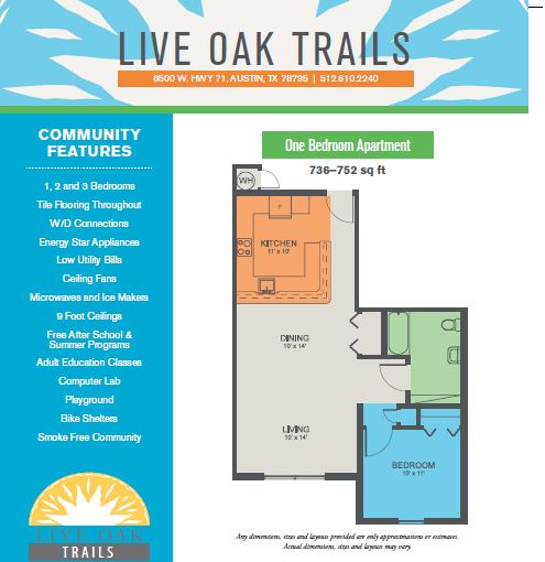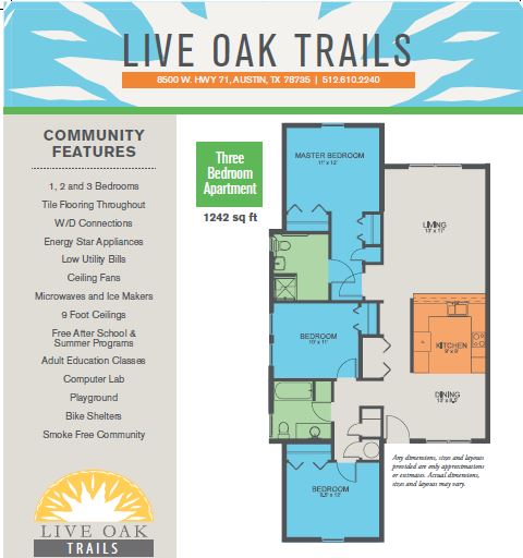 Viviendas asequibles y apartamentos ecológicos en Oak Hill Ubicado en Oak Hill, Live Oak Trails incluye un centro de aprendizaje comunitario en el lugar, área de juegos para niños y senderos para caminar cercanos. Con apartamentos de 1, 2 y 3 habitaciones. *Apartamentos disponibles con acceso para personas con capacidades diferentes.