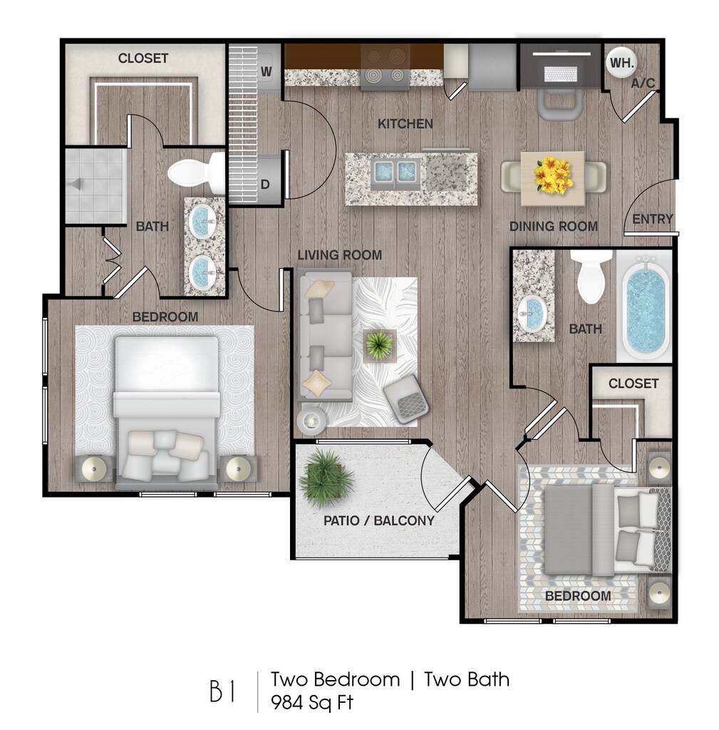 Modelo de apartamento: 2x2Llame para Precios2 Dormitorios, 2 Baños, 984 sq ftNo Disponible![]()