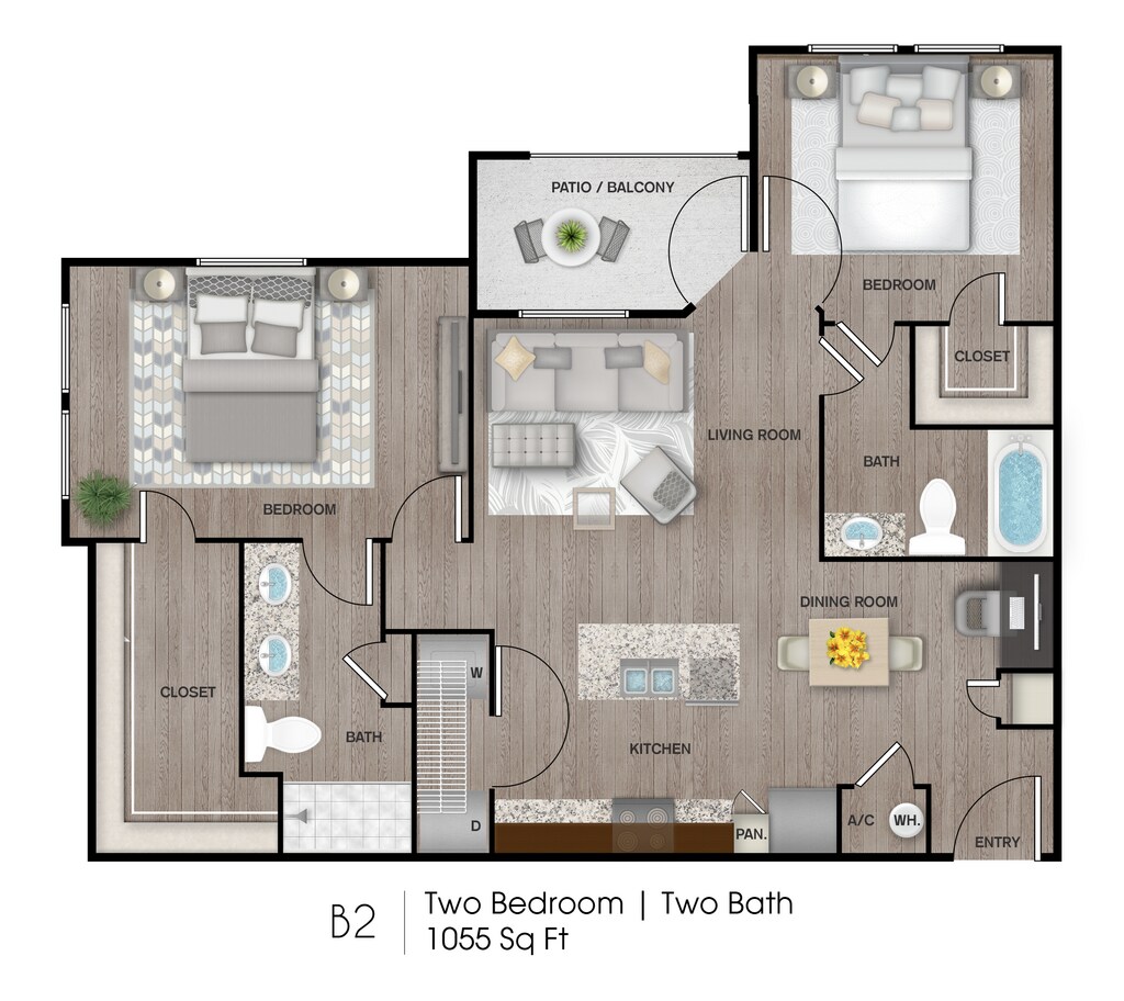 Modelo de apartamento: 2x2Llame para Precios2 Dormitorios, 2 Baños, 1055 sq ftNo Disponible![]()