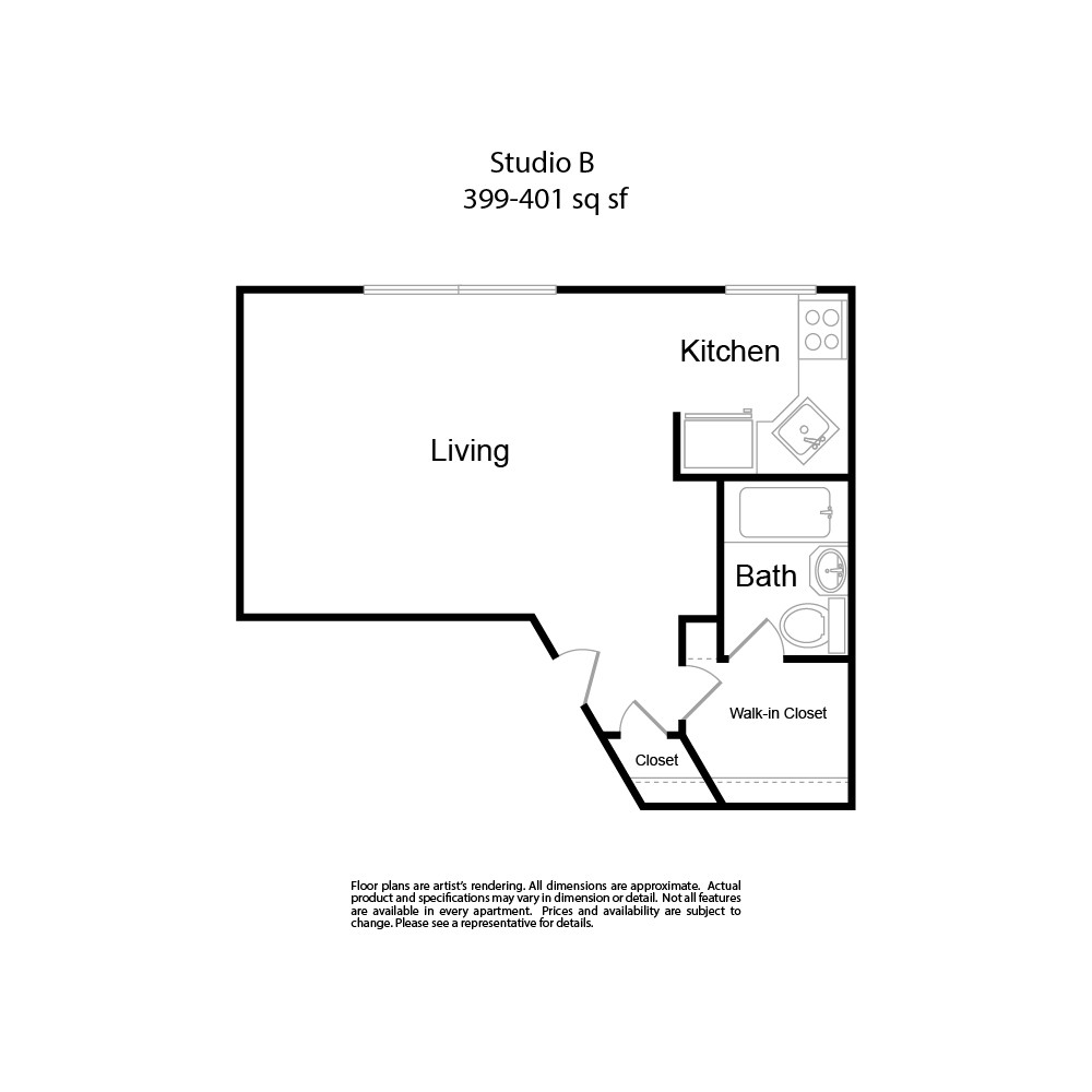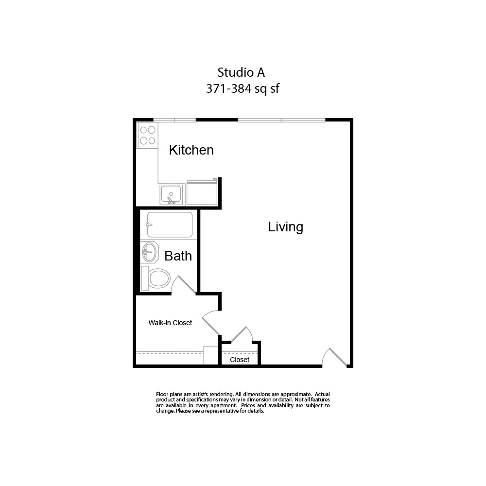 Modelo de apartamento: Studio AEstudio, 1 Baño, 371-375 sq ftDisponible AhoraLos planos de la planta son una interpretación artística. Todas las dimensiones son aproximadas. Los tamaños o el detalle del producto real y sus especificaciones pueden variar. No todas las características están disponibles en todos los hogares para rentar. Los precios y la disponibilidad están sujetos a cambios. El alquiler que se muestra es mensual. Se pueden aplicar ciertos cargos, por ejemplo, entrega de paquetes, recolección de basura, agua, servicios, etc. Depositos varian. Consulta a un representante para conocer detalles.