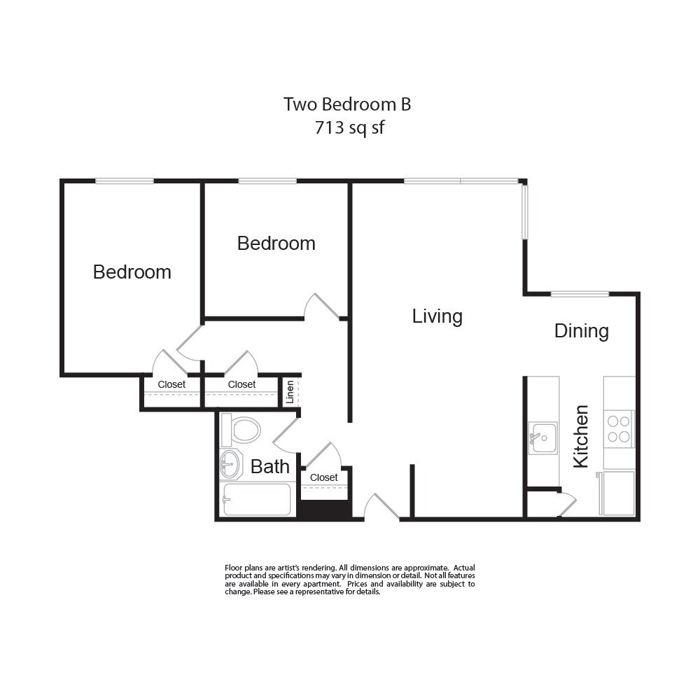 2 Dormitorios, 1 Baño, 713 pies²Galería del Modelo