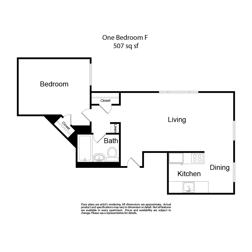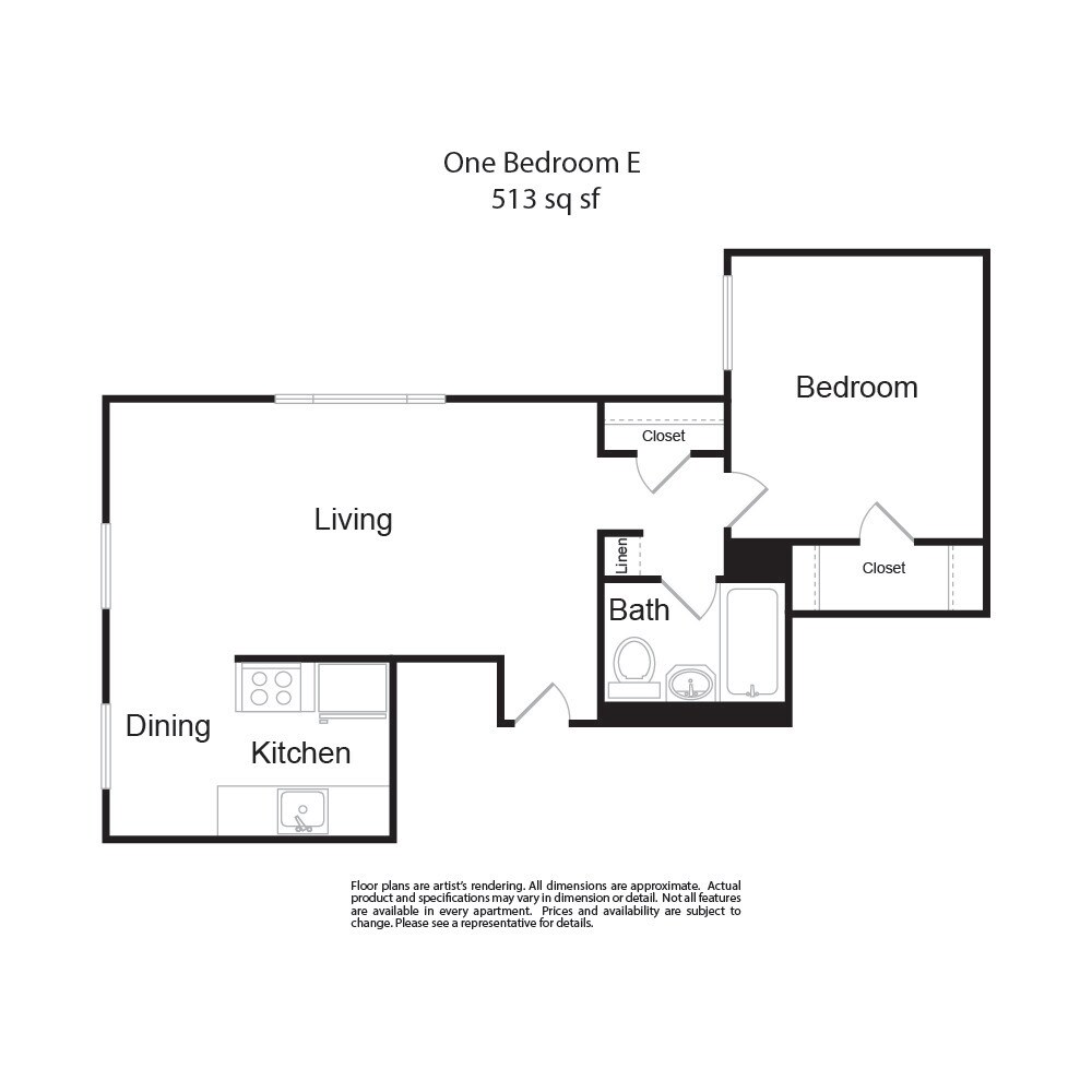 Modelo de apartamento: One Bedroom E1 Dormitorio, 1 Baño, 513 sq ftDisponible AhoraLos planos de la planta son una interpretación artística. Todas las dimensiones son aproximadas. Los tamaños o el detalle del producto real y sus especificaciones pueden variar. No todas las características están disponibles en todos los hogares para rentar. Los precios y la disponibilidad están sujetos a cambios. El alquiler que se muestra es mensual. Se pueden aplicar ciertos cargos, por ejemplo, entrega de paquetes, recolección de basura, agua, servicios, etc. Depositos varian. Consulta a un representante para conocer detalles.
