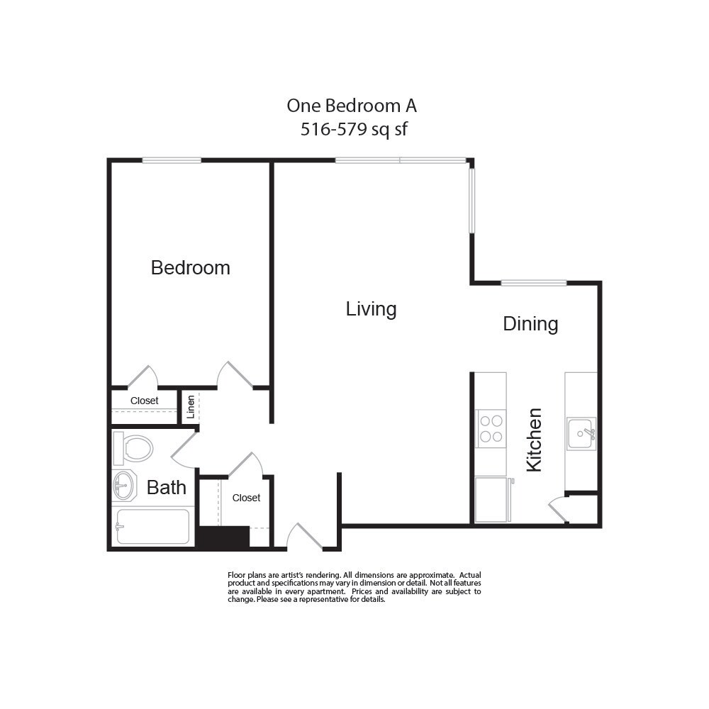 Modelo de apartamento: One Bedroom A1 Dormitorio, 1 Baño, 517-579 sq ftDisponible AhoraLos planos de la planta son una interpretación artística. Todas las dimensiones son aproximadas. Los tamaños o el detalle del producto real y sus especificaciones pueden variar. No todas las características están disponibles en todos los hogares para rentar. Los precios y la disponibilidad están sujetos a cambios. El alquiler que se muestra es mensual. Se pueden aplicar ciertos cargos, por ejemplo, entrega de paquetes, recolección de basura, agua, servicios, etc. Depositos varian. Consulta a un representante para conocer detalles.
