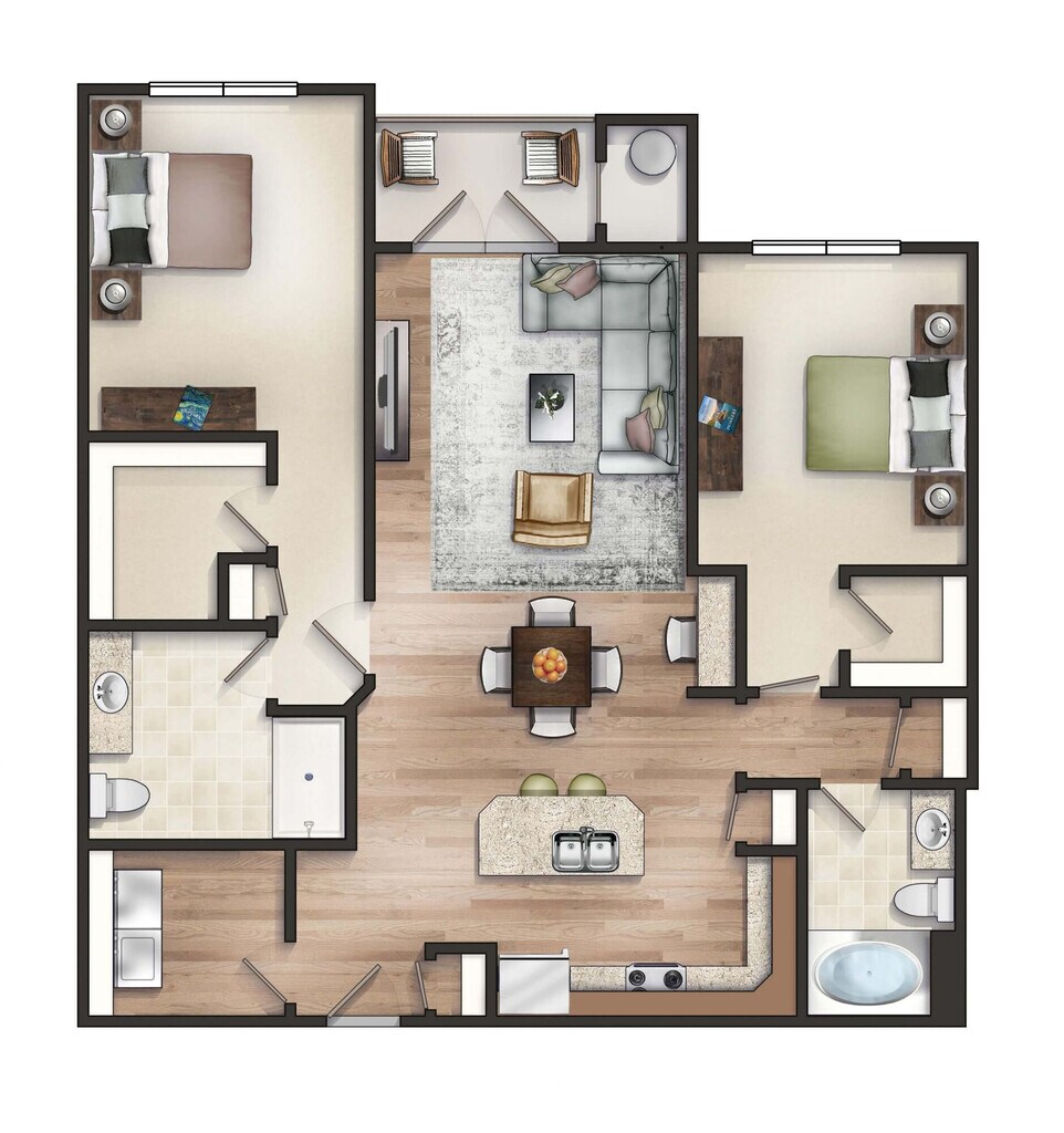 2 Dormitorios, 2 Baños, 1290 pies²El más grandeEsta opción tiene las unidades más grandes para este modeloGalería del Modelo