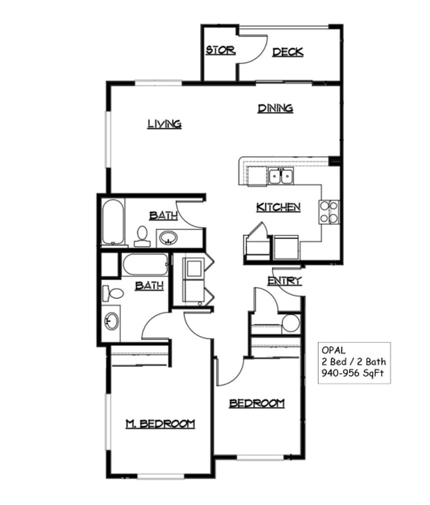 Modelo de apartamento: Opal - 956 SQFT$1,8992 Dormitorios, 2 Baños, 956 sq ftNo DisponibleOpal - 956 SQFT - Plano 1