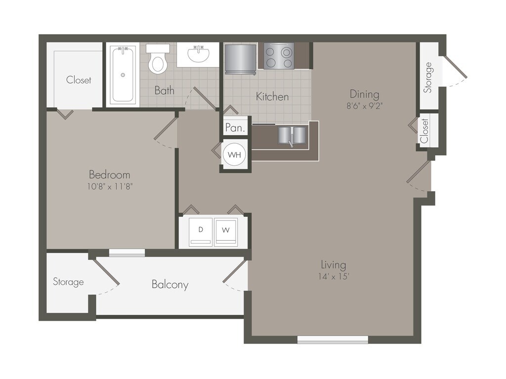 1 Dormitorio, 1 Baño, 843 pies²Disponible AhoraGalería del Modelo