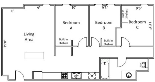 3 Dormitorios, 1 Baño, 970 pies²Galería del Modelo