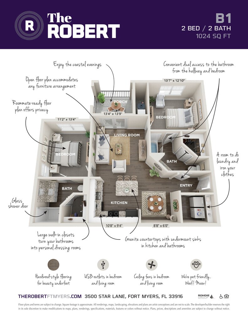 ¡NUEVO y todo a tu alcance! En el corazón de Fort Myers, The Robert ubicado a la salida de la I-75 y a pocos minutos del centro de la ciudad, tiendas y una gran cantidad de playas. The Robert Apartments está convenientemente ubicado cerca de Alliance for The Arts, Florida Gulf Coast University, IMAG History & Science Center, del Aeropuerto Internacional de Southwest Regional, Six Mile Cypress Slough Preserve y al aeropuerto internacional Southwest Florida Esta maravillosa ubicación te permite estar muy cerca de las oportunidades de aventura y lugares de entretenimiento para todos. Tenemos una vida sin necesidad de mantenimiento, servicios con estilo de centro turístico y un estilo de vida de lujo en todos los aspectos. El verdadero significado de lujo y comodidad Encimeras de granito. Electrodomésticos negros mate. Armarios blancos a medida. Lavadoras y secadoras. Una variedad de opciones de diseño. Desde accesorios y acabados bien diseñados a inspiradoras abiertos planos de planta, todos los detalles de tu nuevo apartamento ha sido cuidadosamente considerado, para que puedas disfrutar de una experiencia privada y tranquila. Cada apartamento maximiza de forma única el espacio y la iluminación con conceptos de planos abiertos y amplias ventanas ubicadas de forma perfecta en el dorado de las puestas de sol.