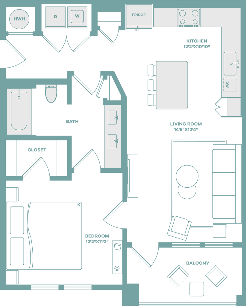 Modelo de apartamento: A1Desde $1,4091 Dormitorio, 1 Baño, 740 sq ftDisponible Ahora![]()