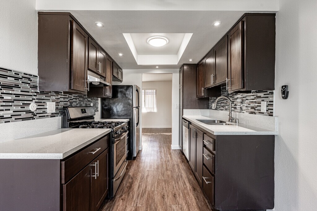 - Electrodomésticos de cocina de acero inoxidable que incluyen: refrigerador, horno a gas autolimpiante, lavavajillas