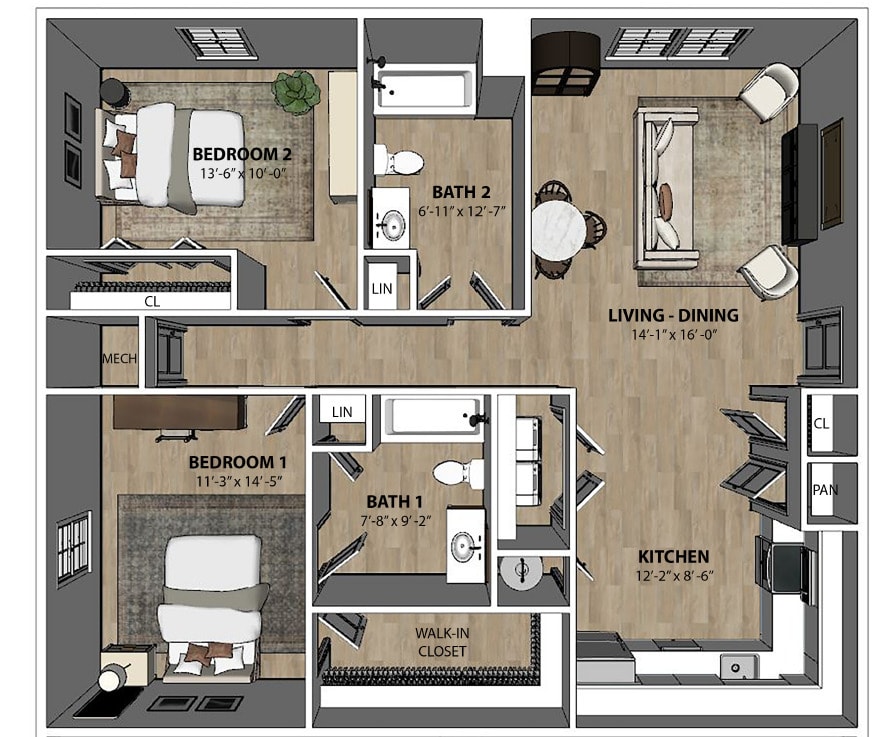 Dawson -2A - Plano 12 Unidad de apartamento: 205Modelo de apartamento: Dawson -2A$1,8502 Dormitorios, 2 Baños, 1251 sq ftDisponible January 1, 2026