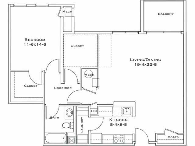 1 Dormitorio, 1 Baño, 795 pies²Precio Mensual TotalDisponible Oct 10Galería del Modelo