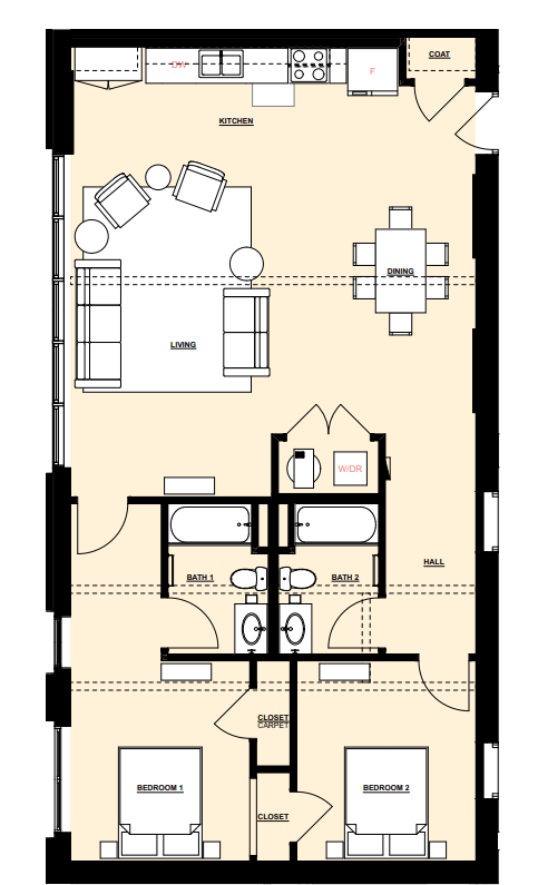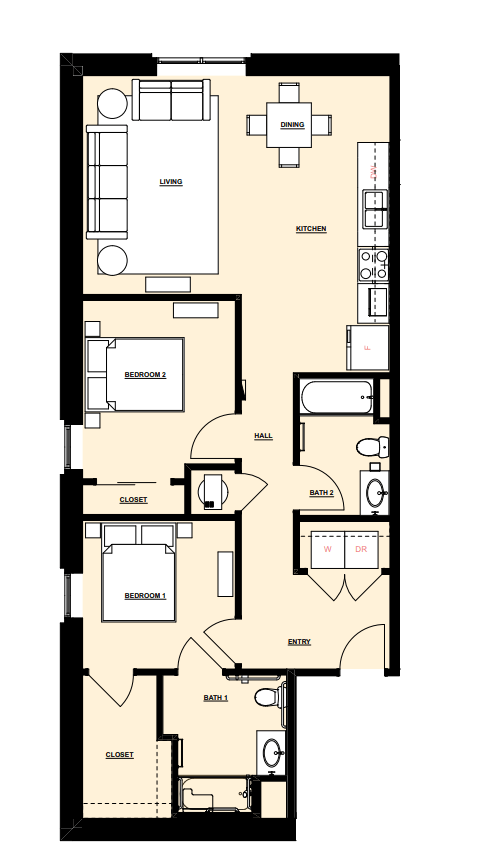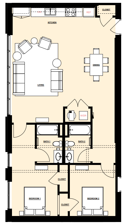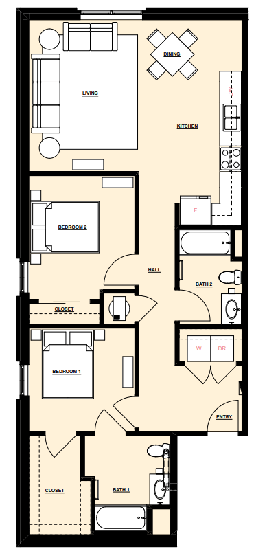 Modelo de apartamento: A2$1,2361 Dormitorio, 1 Baño, 1085 sq ftDisponible Ahora![]()