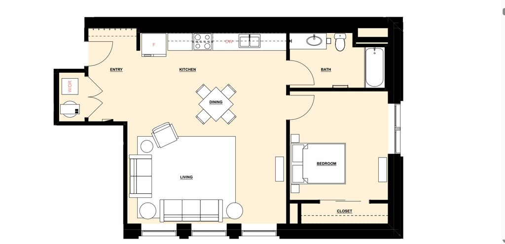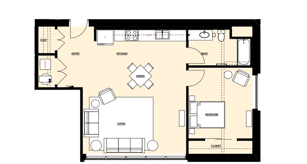 1 Dormitorio, 1 Baño, 815 pies²Galería del Modelo
