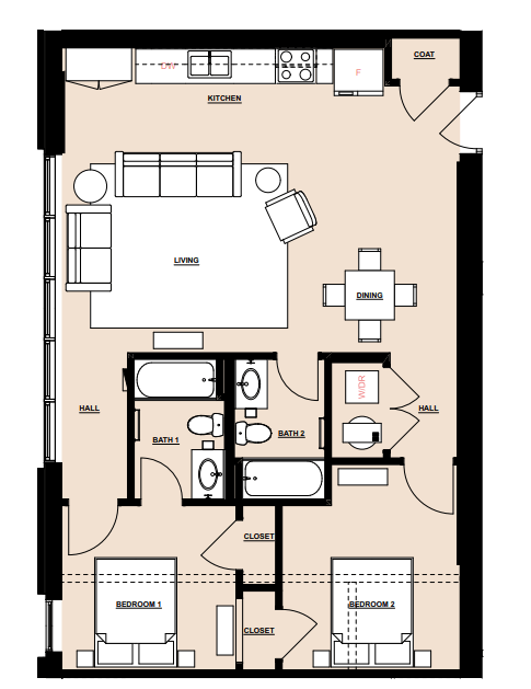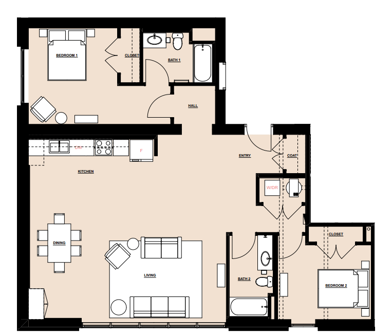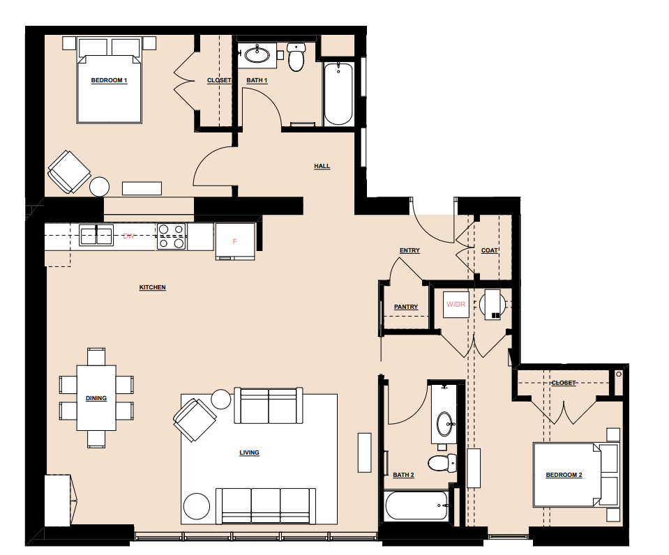 1 Dormitorio, 1 Baño, 1069 pies²Disponible AhoraGalería del Modelo