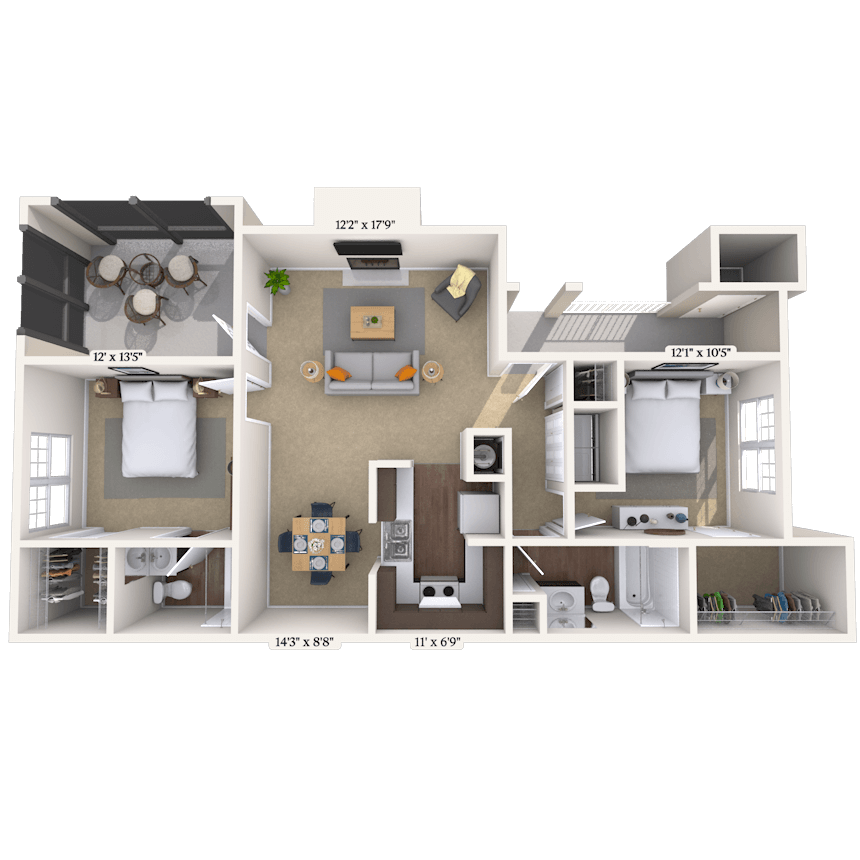 Modelo de apartamento: Buck IIDesde $1,5682 Dormitorios, 2 Baños, 1206 sq ftDisponible Ahora![]()