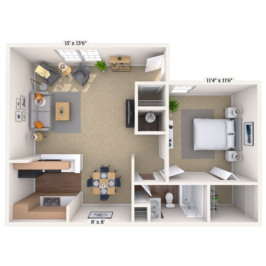 1 Dormitorio, 1 Baño, 850 pies²Disponible AhoraGalería del Modelo