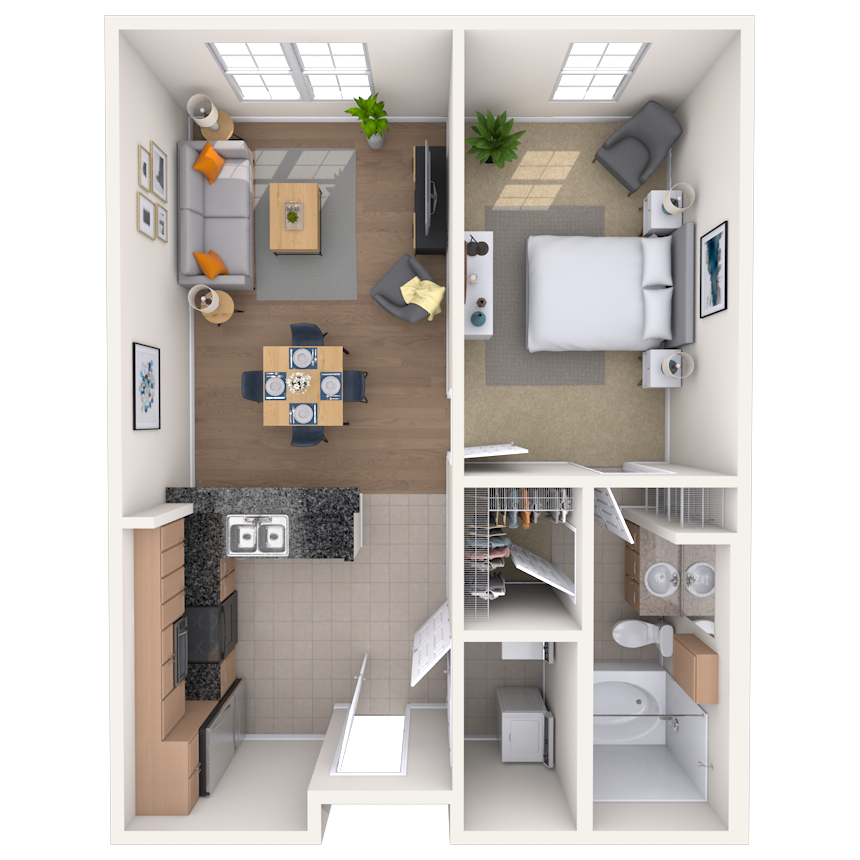 Modelo de apartamento: Studio 0x1 447-740 SFDesde $1,365Estudio, 1 Baño, 447-521 sq ftDisponible Ahora![]()