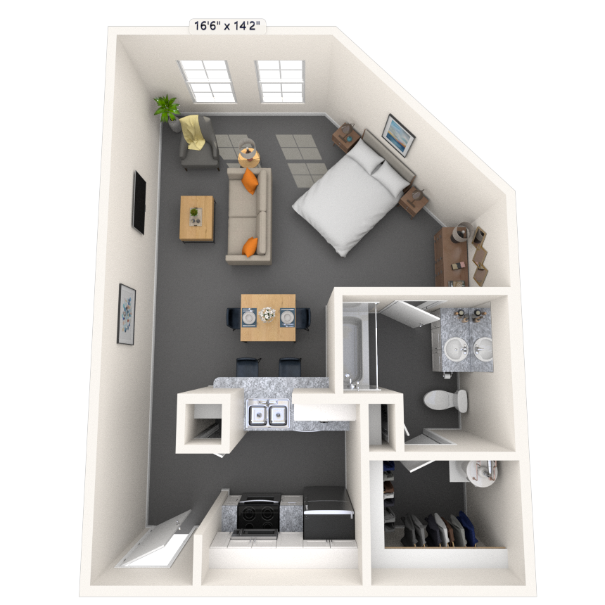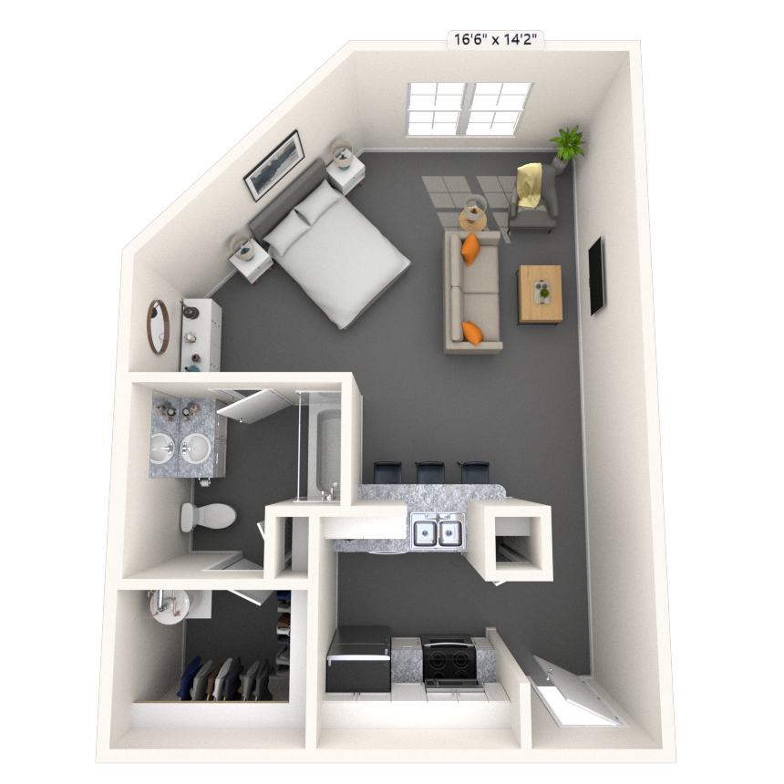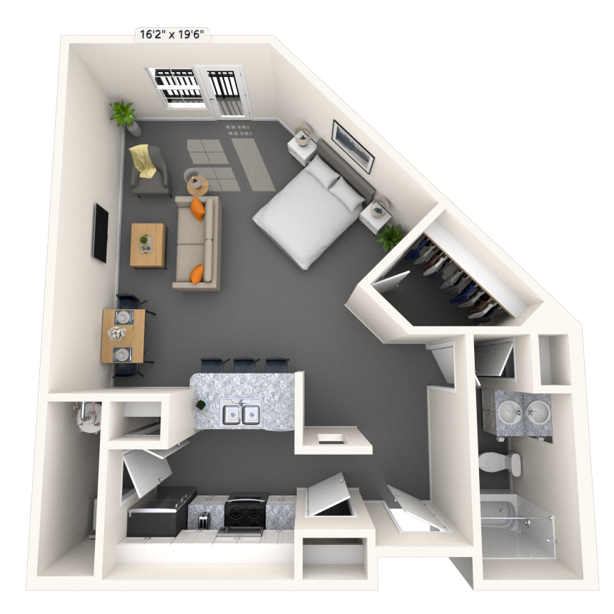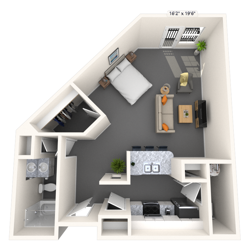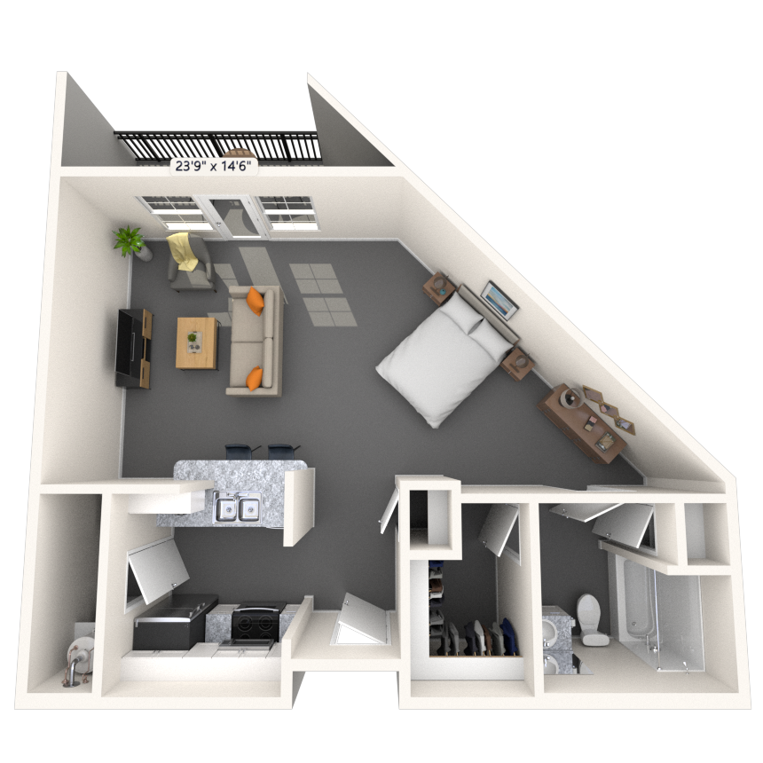 Unidad de apartamento: 1319Modelo de apartamento: Studio 0x1 486-583 SF$1,325Estudio, 1 Baño, 583 sq ftDisponible Ahora![]()
