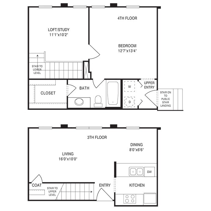 Traditional 1x1 729 SF - Plano 1 Dual Level 1x1 818 SF