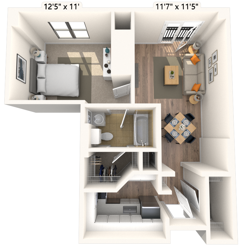 Modelo de apartamento: Traditional 1x1 609-641 SFDesde $1,8001 Dormitorio, 1 Baño, 607 sq ftDisponible Ahora![]()
