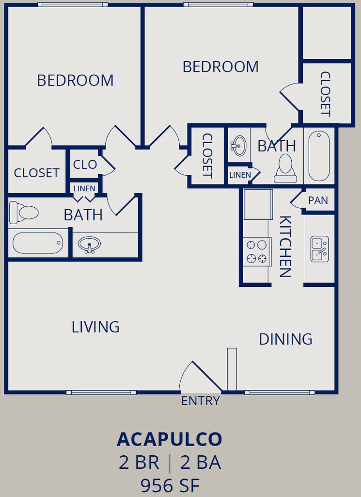 Modelo de apartamento: AcapulcoDesde $1,1902 Dormitorios, 2 Baños, 956 sq ftDisponible Ahora![]()