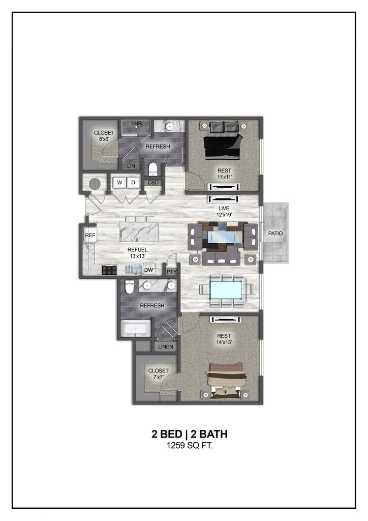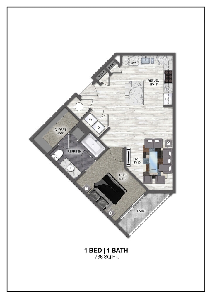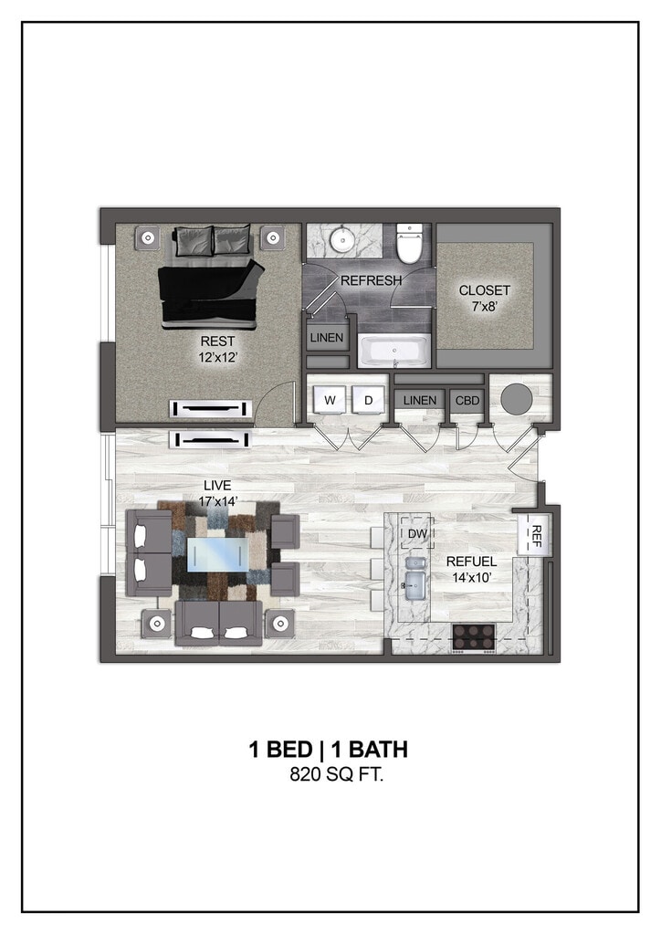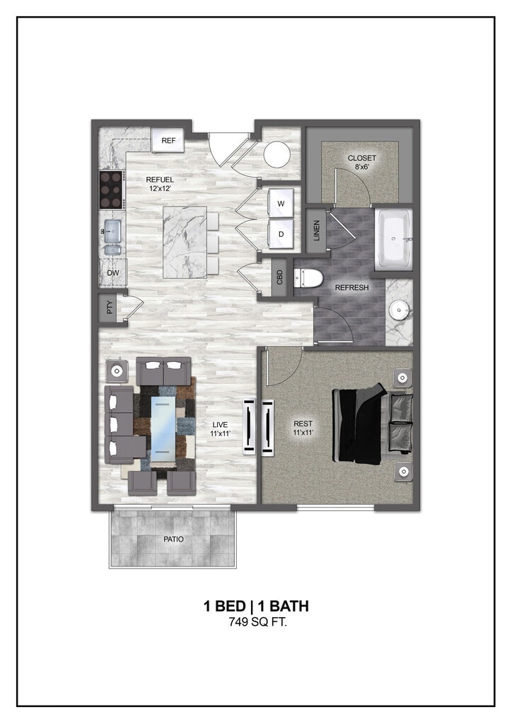 1 Dormitorio, 1 Baño, 749 pies²Precio Mensual TotalDisponible AhoraPrecio Mensual Total