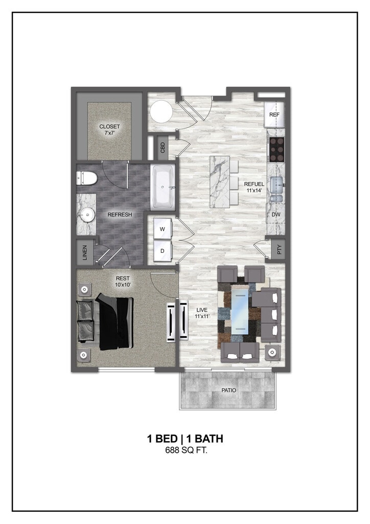Modelo de apartamento: A3Desde $1,4381 Dormitorio, 1 Baño, 688 sq ftDisponible AhoraLos planos son representaciones artísticas. Todas las dimensiones son aproximadas. El producto y las especificaciones reales pueden variar en tamaño o detalle. No todas las características están disponibles en cada vivienda en alquiler. Por favor, consulta con un representante para obtener más detalles.