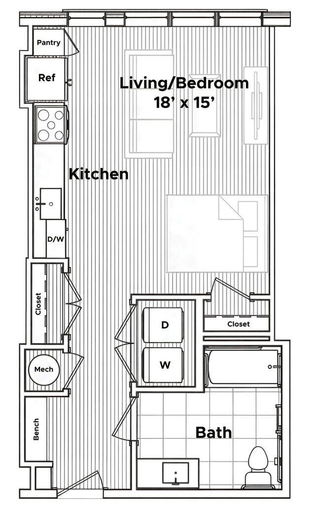 Estudio, 1 Baño, 528-532 pies²Disponible AhoraGalería del Modelo
