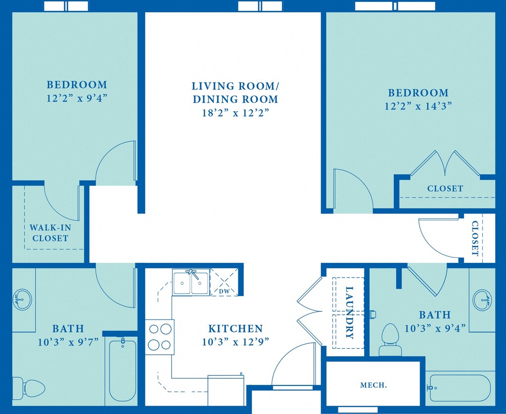 Modelo de apartamento: Two Bedroom2 Dormitorios, 2 Baños, 890-908 sq ftDisponible AhoraTwo Bedroom - Plano 1