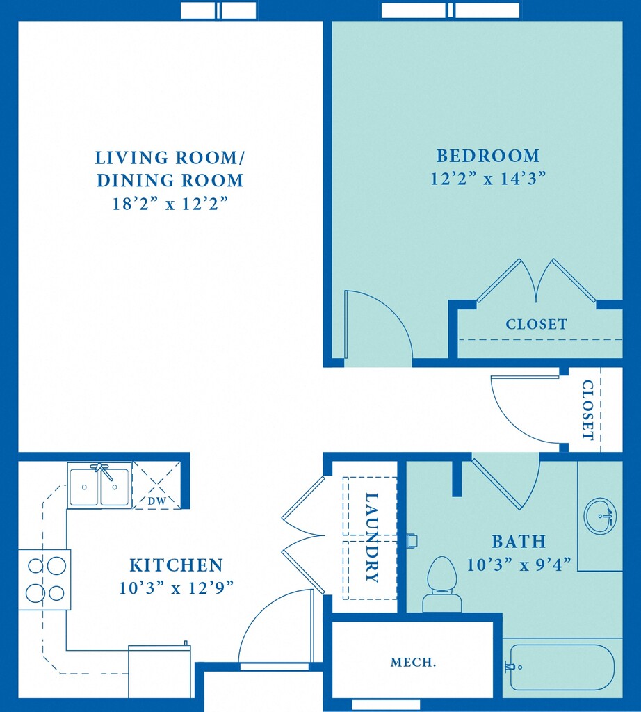 Modelo de apartamento: One Bedroom1 Dormitorio, 1 Baño, 651-658 sq ftDisponible AhoraOne Bedroom - Plano 1 2 Dormitorios