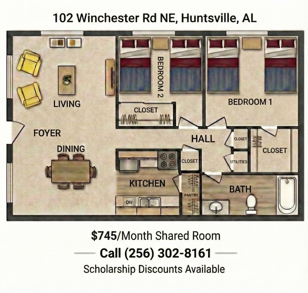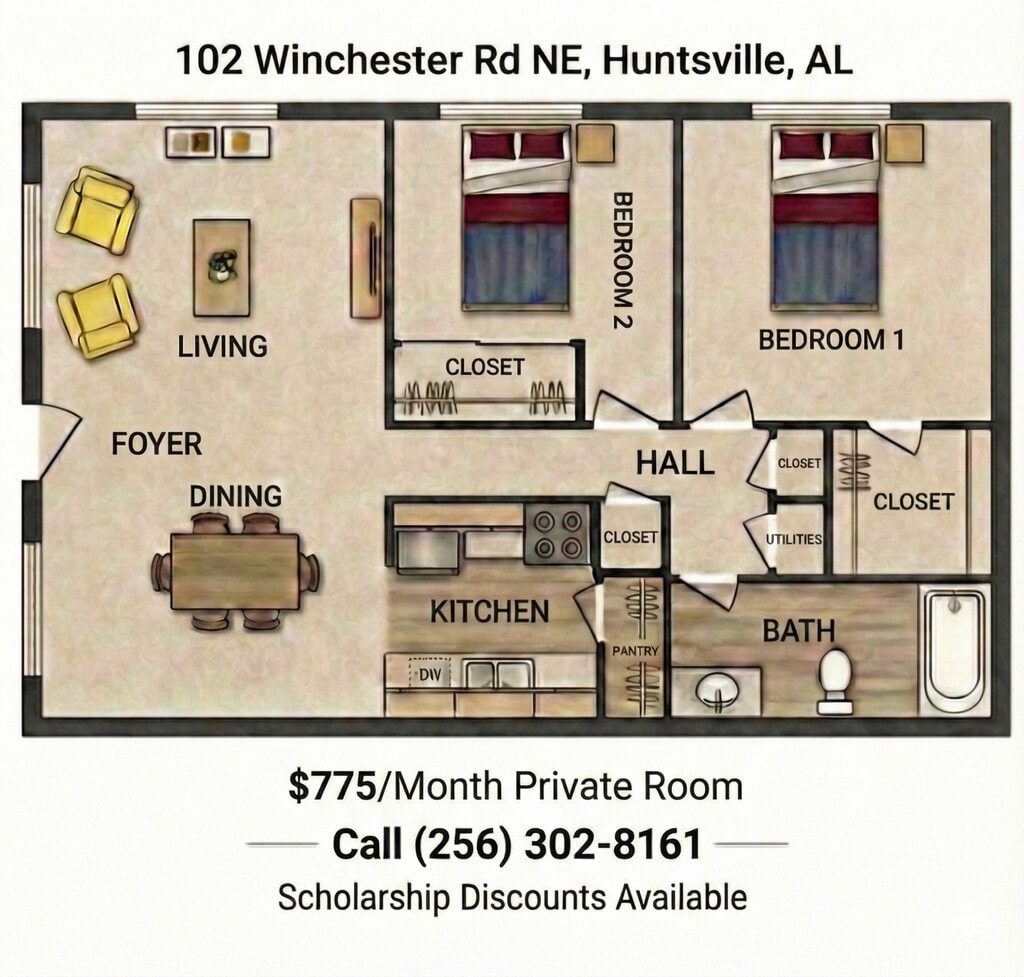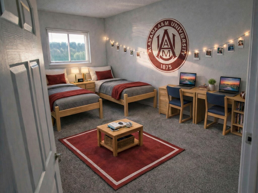 Alabama A&M Student Apartments offer convenient, student-focused living directly across the street from Alabama A&M University and just 10 minutes from the University of Alabama in Huntsville. Designed for student success, all apartments are spacious 2-bedroom units with flexible options for private or shared bedrooms, high-speed fiber internet, and student-friendly leasing. Residents enjoy a safe, quiet, and highly monitored community with 24/7 security cameras, on-site security, and a parent-approved environment. Scholarship students may qualify for special discounts with proof. Monthly pricing starts at $745 for shared rooms and $775 for private rooms.
