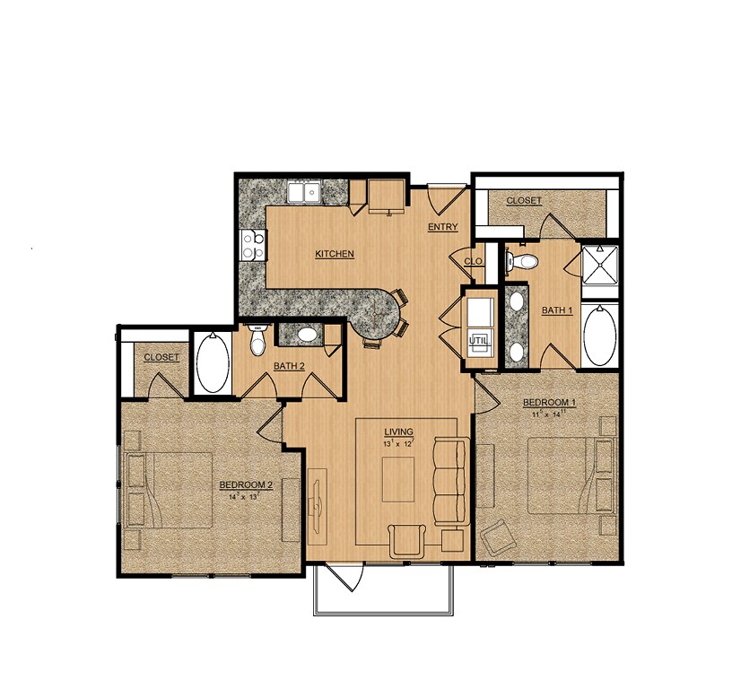 Azalea - Plano 1 Unidad de apartamento: 212Modelo de apartamento: Azalea2 Dormitorios, 2 Baños, 1145 sq ftDisponible AhoraGardenia