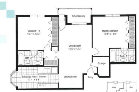 Modelo de apartamento: Willow$1,6252 Dormitorios, 2 Baños, 1170 sq ftNo DisponibleWillow - Plano 1 Willow - Plano 2