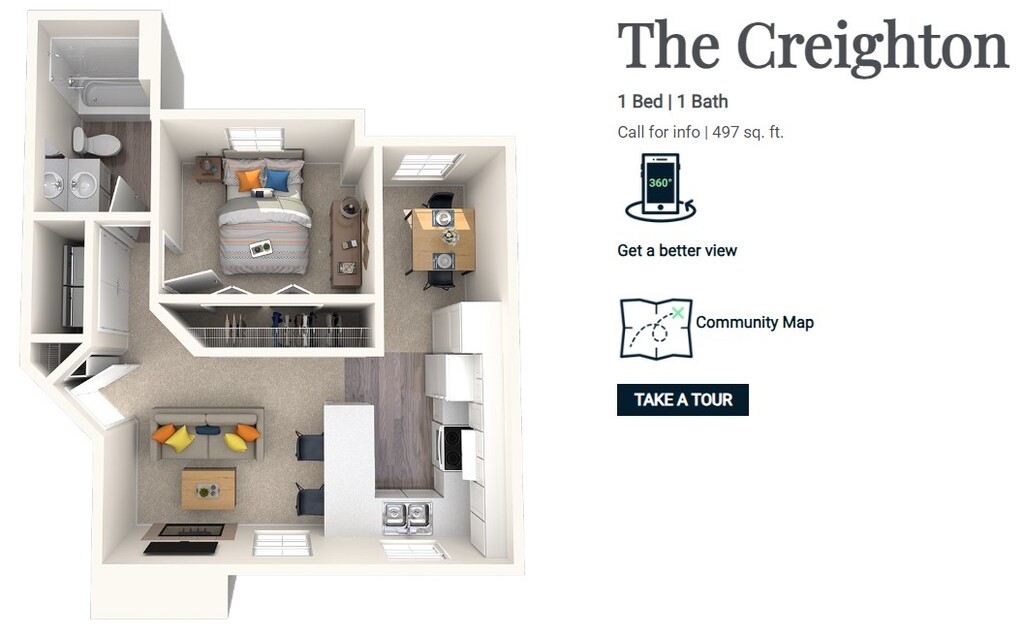 The Creighton - Plano 2 Unidad de apartamento: 145804Modelo de apartamento: The Creighton$1,4481 Dormitorio, 1 Baño, 497 sq ftDisponible AhoraLos planos son representaciones artísticas. Todas las dimensiones son aproximadas. El producto y las especificaciones reales pueden variar en tamaño o detalle. No todas las características están disponibles en cada vivienda en alquiler. Por favor, consulta con un representante para obtener más detalles.