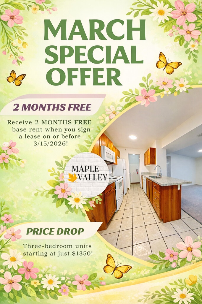 La promoción que hay actualmente para la renta en Maple Valley es: 2 MONTHS FREE Base Rent for New Resident Leases Signed in March~~MARCH SPECIAL: Receive 2 MONTHS of FREE base rent with a new lease signing on or before 3/15/26!!!! (Offer applicable to new residents only.) Call today for a tour and details on our Move-In Special! The apartments include Air Conditioning, Washer, and Dryer, and Covered Parking.
