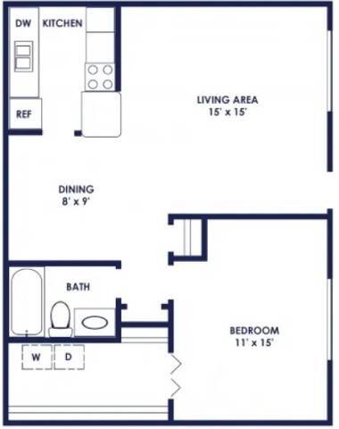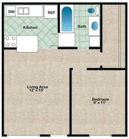 Modelo de apartamento: A1Desde $8851 Dormitorio, 1 Baño, 550 sq ftDisponible Ahora![]()