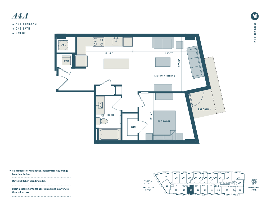 Unidad de apartamento: 1209Modelo de apartamento: A1A1 Dormitorio, 1 Baño, 561 sq ftDisponible October 21, 2025Plano: A3A