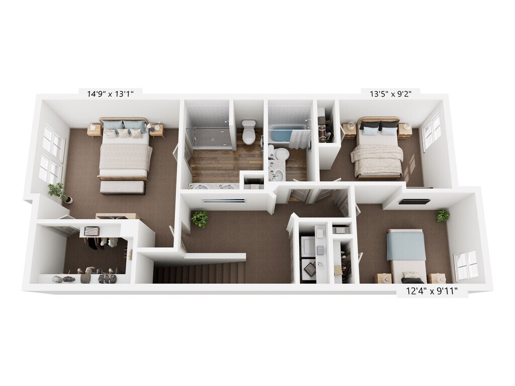 Modelo de apartamento: Pineland A$2,7393 Dormitorios, 2.5 Baños, 1649 sq ftDisponible AhoraLos planos son representaciones artísticas. Todas las dimensiones son aproximadas. El producto y las especificaciones reales pueden variar en tamaño o detalle. No todas las características están disponibles en cada vivienda en alquiler. Por favor, consulta con un representante para obtener más detalles.