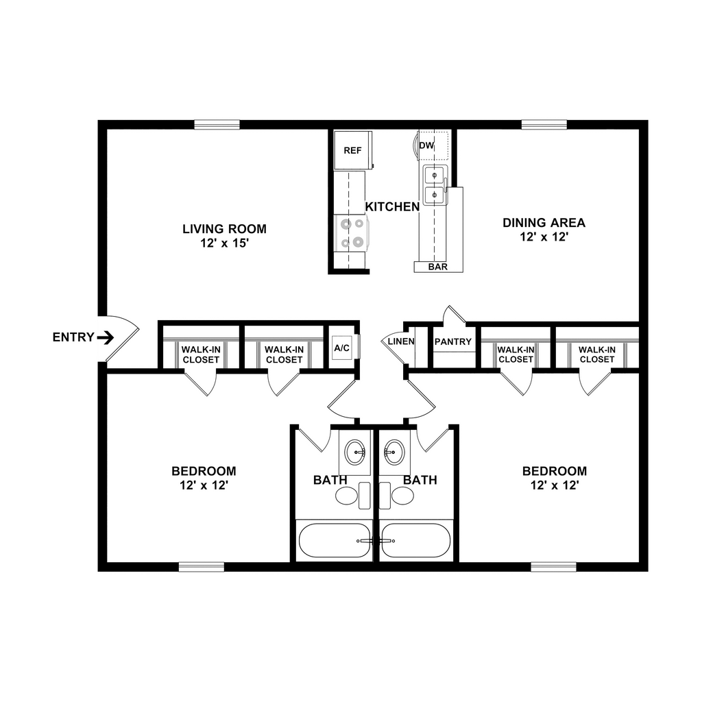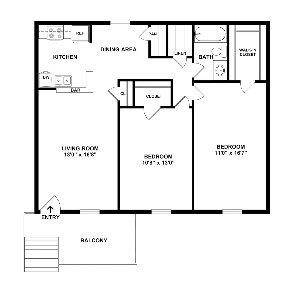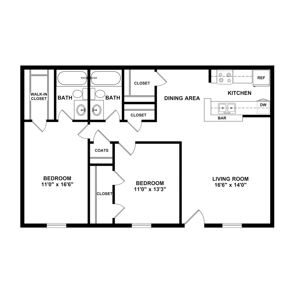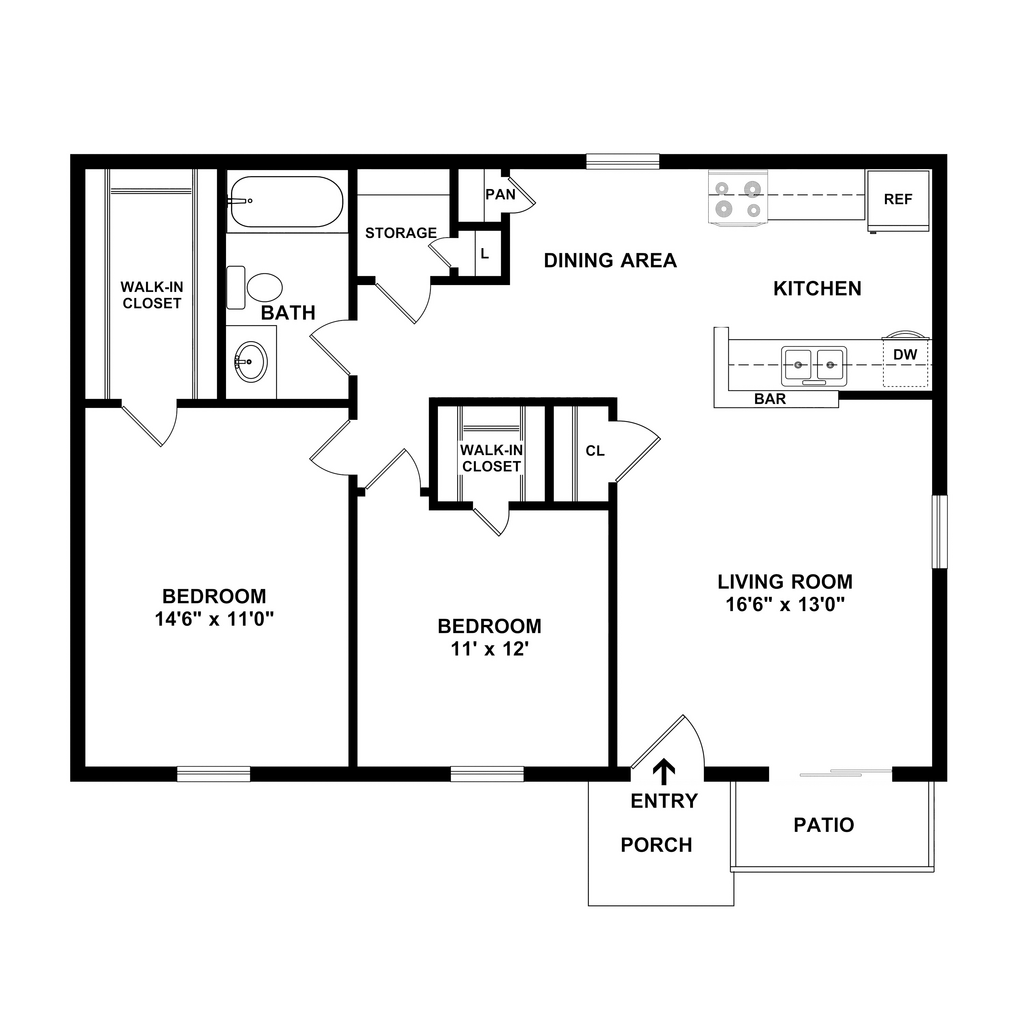 Modelo de apartamento: D-2 Renovated2 Dormitorios, 1 Baño, 864 sq ftDisponible Ahora![]()