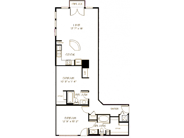 Studio 1 - Plano 1 Unidad de apartamento: 0206Modelo de apartamento: Studio 11 Dormitorio, 1 Baño, 683 sq ftDisponible Ahora![]()