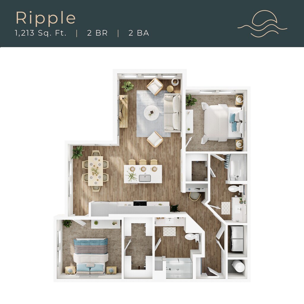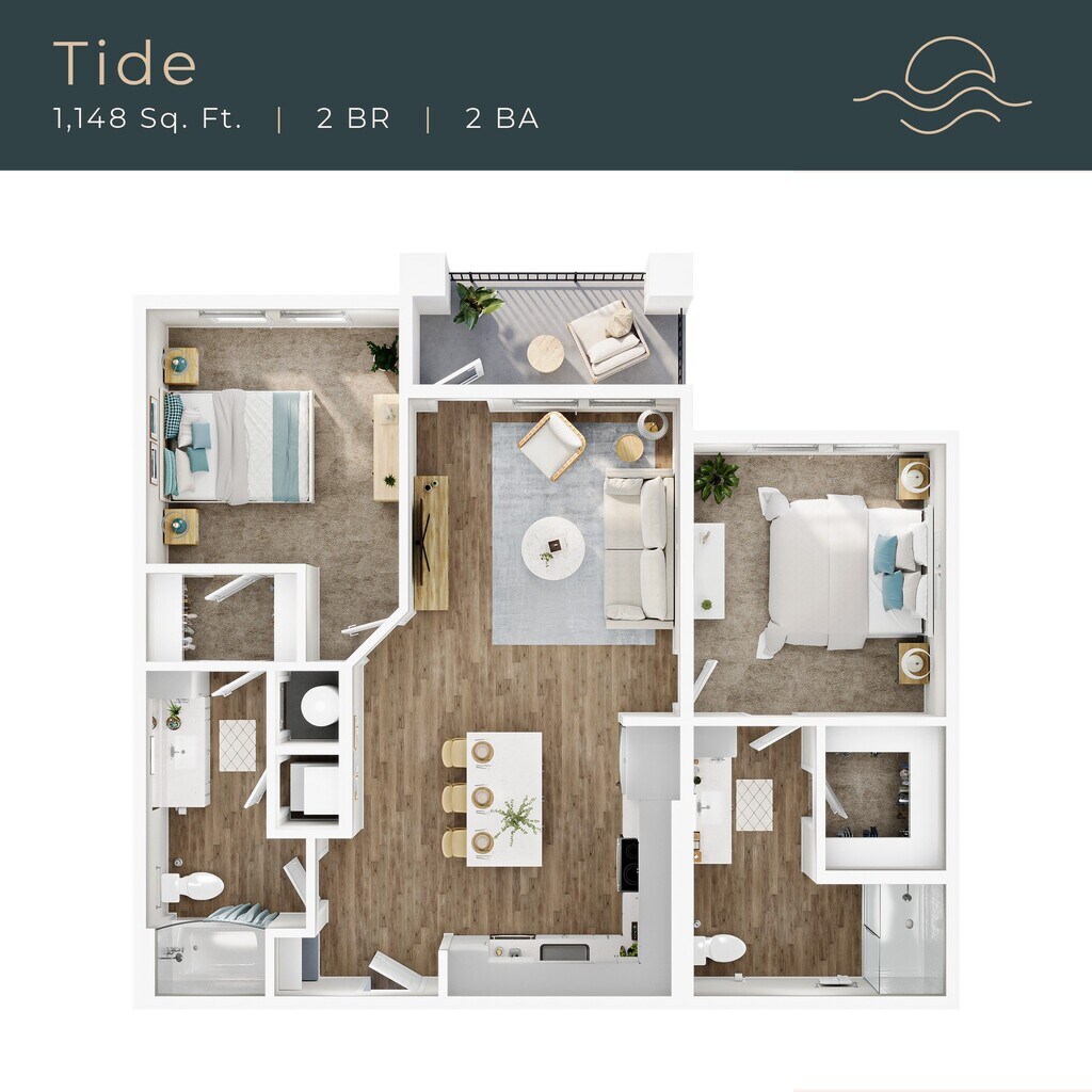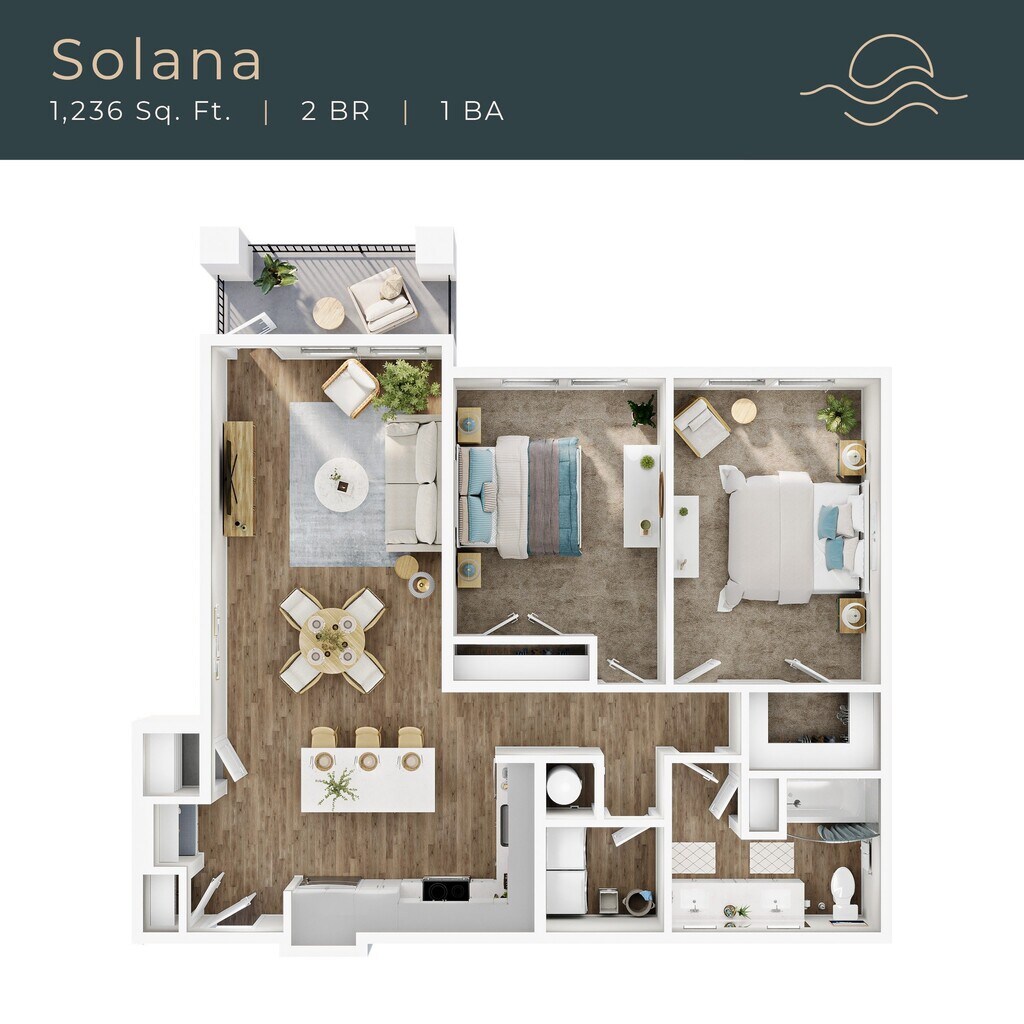 Solana - Plano 2 Unidad de apartamento: 101Modelo de apartamento: Solana$2,0152 Dormitorios, 1 Baño, 1236 sq ftDisponible June 30, 2026Tide