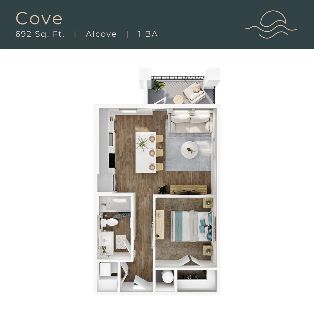 Modelo de apartamento: CoveDesde $1,4001 Dormitorio, 1 Baño, 692 sq ftDisponible June 30, 2026![]()