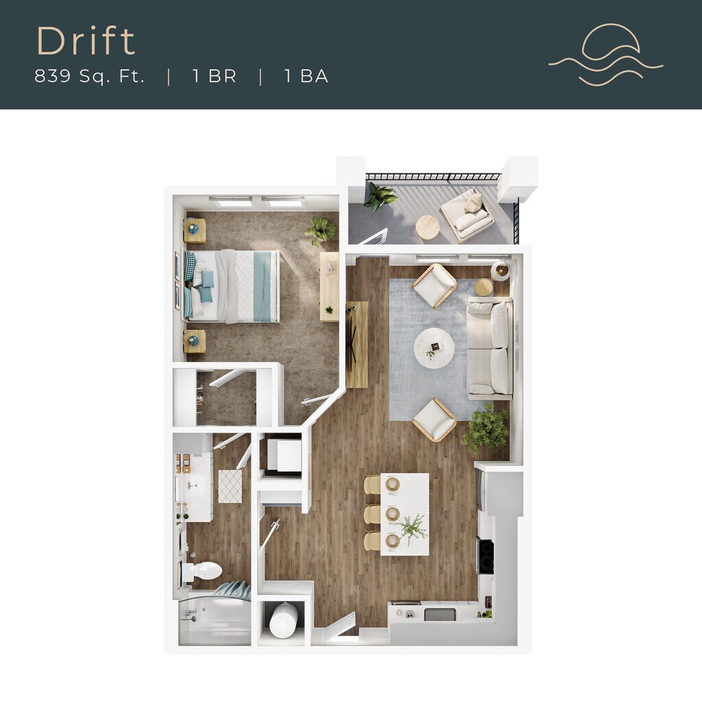 Modelo de apartamento: DriftDesde $1,5001 Dormitorio, 1 Baño, 839 sq ftDisponible June 30, 2026![]()