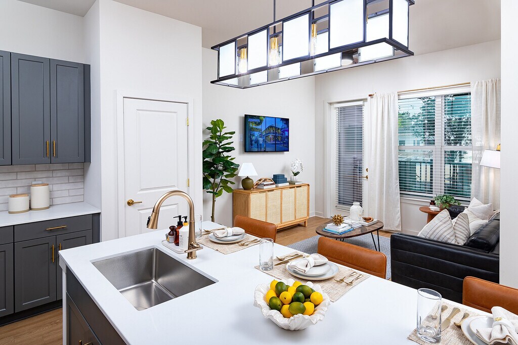 - Elegantes encimeras de cuarzo e iluminación colgante