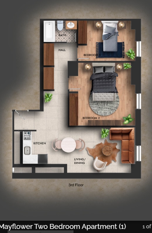 Modelo de apartamento: 2 Beds, 1 bathLlame para Precios2 Dormitorios, 1 Baño, 1000 sq ftDisponible Ahora2 Beds, 1 bath - Plano 1