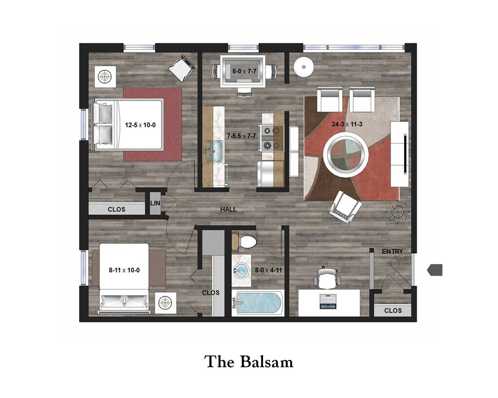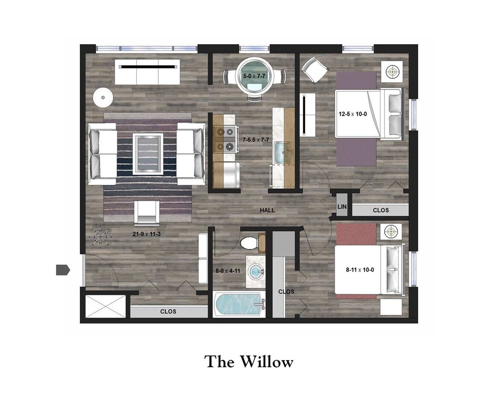 2 Dormitorios, 1 Baño, 707-842 pies²Precio Mensual TotalDisponible AhoraGalería del Modelo
